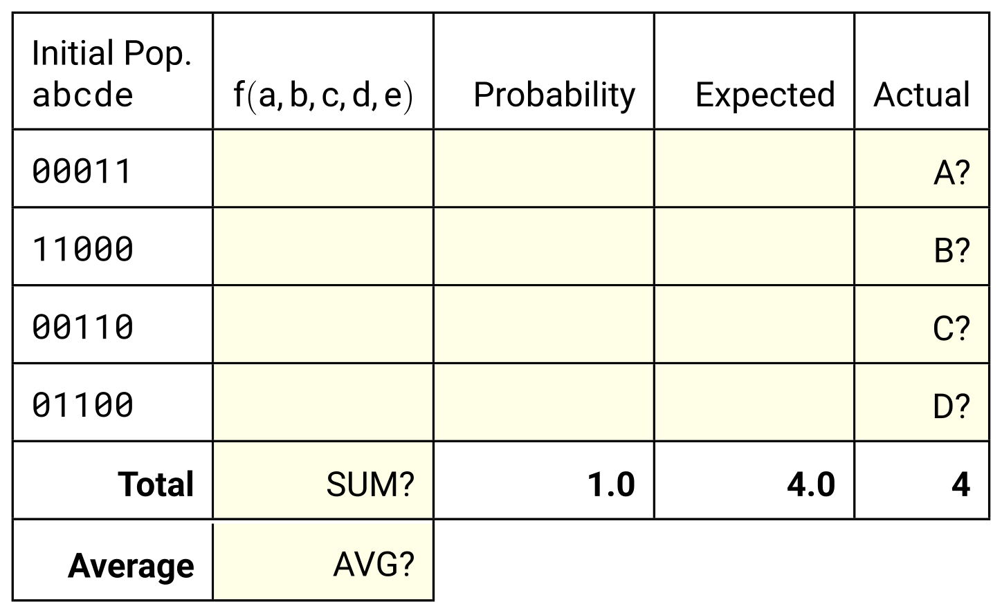 Fill in the missing values in the table. Assuming that the actual candidates selected are proportional to the expected number, what are the values of A, B, C, and D? They represent how many copies of the candidate are selected, and will be in the range of 0 to 4.